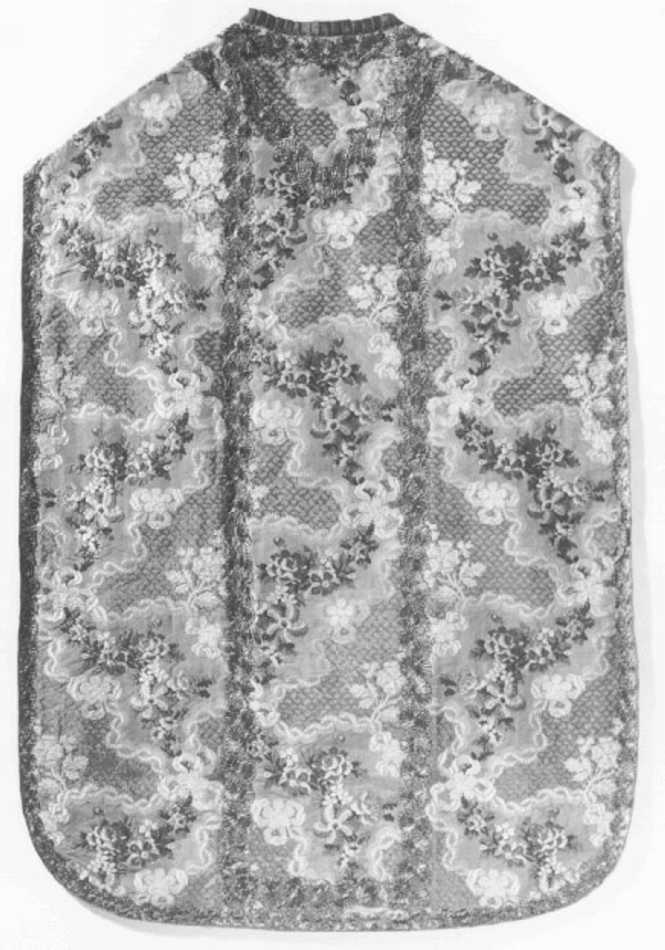 Tessuto: fondo viola con motivi ottenuti per trame liseré e per trame broccate in sete policrome. Gallone: a fuselli in oro filato e lamellare. Fodera: taffetas viola