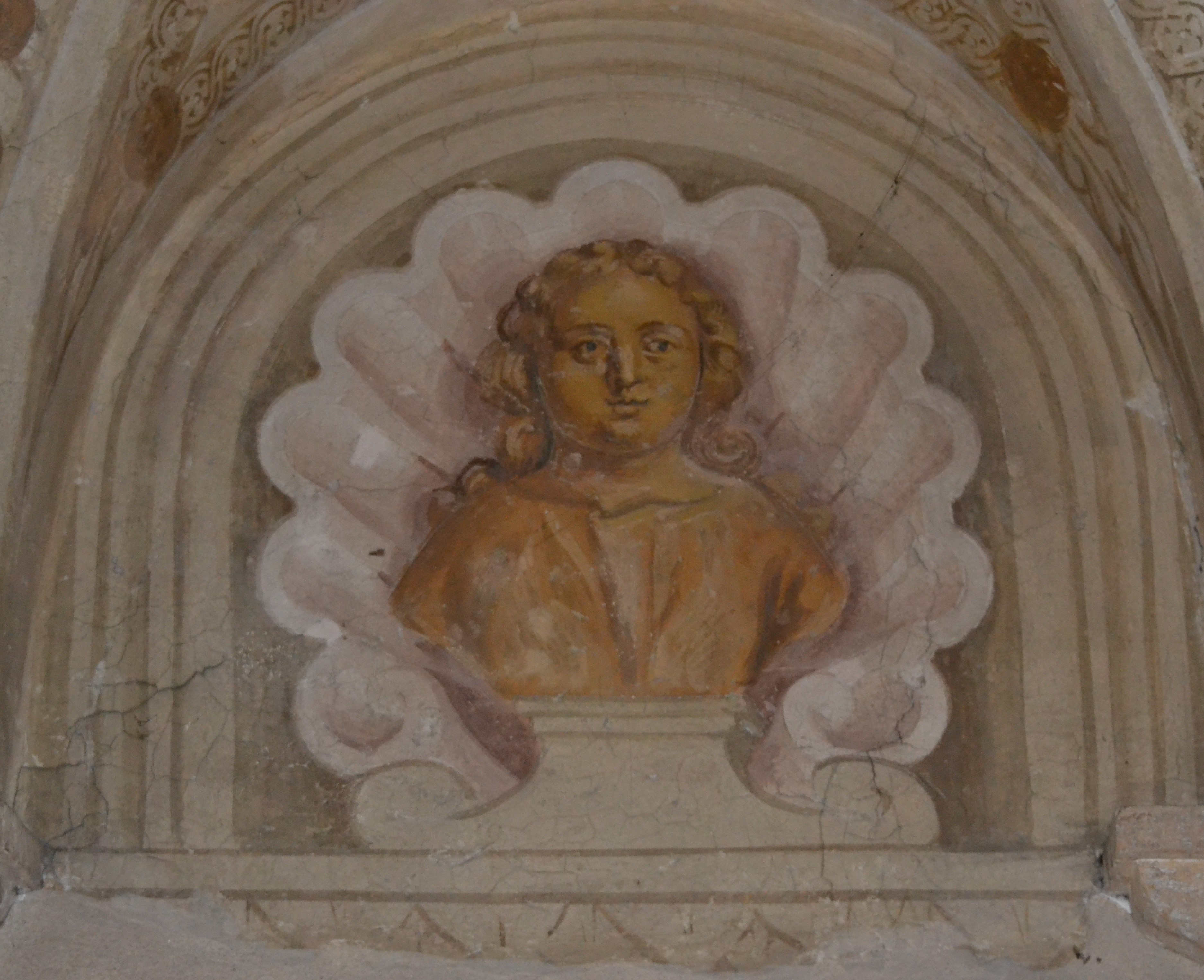 Lunetta dipinta a simulazione di una nicchia marmorea con cornice modanata. All’interno vi è raffigurata una conchiglia la cui base fa da sostegno a un busto femminile, anch’esso dipinto, i cui capelli ricci ricadono dietro le spalle