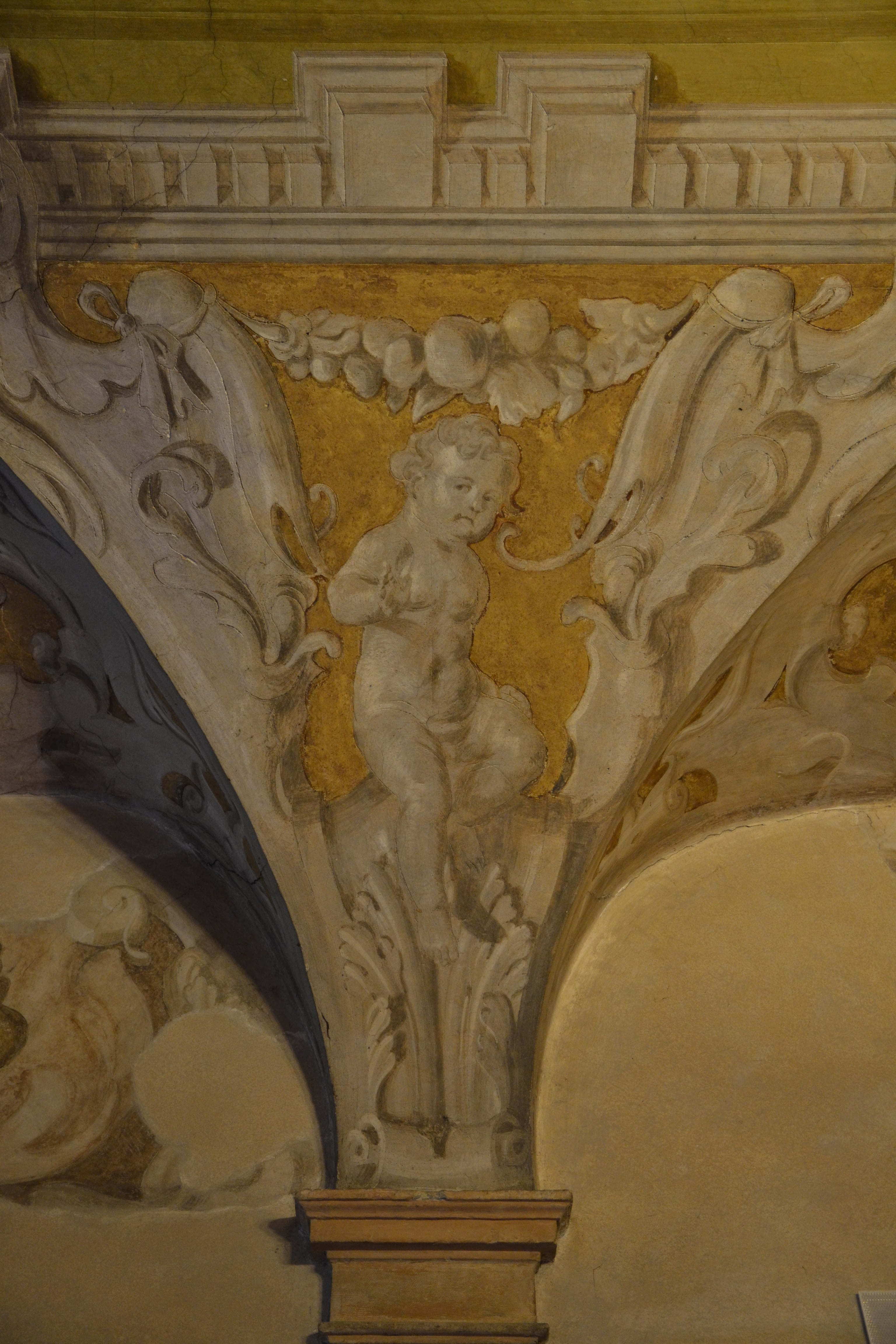Motivi decorativi a finti stucchi/ putto/ festone con frutti/ mascheroni