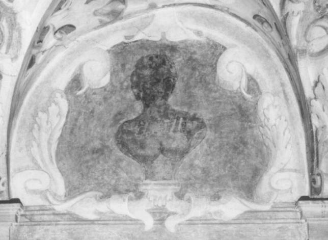 Lunetta dipinta con cornice a finto stucco e busto femminile al suo interno, dipinto a monocromo