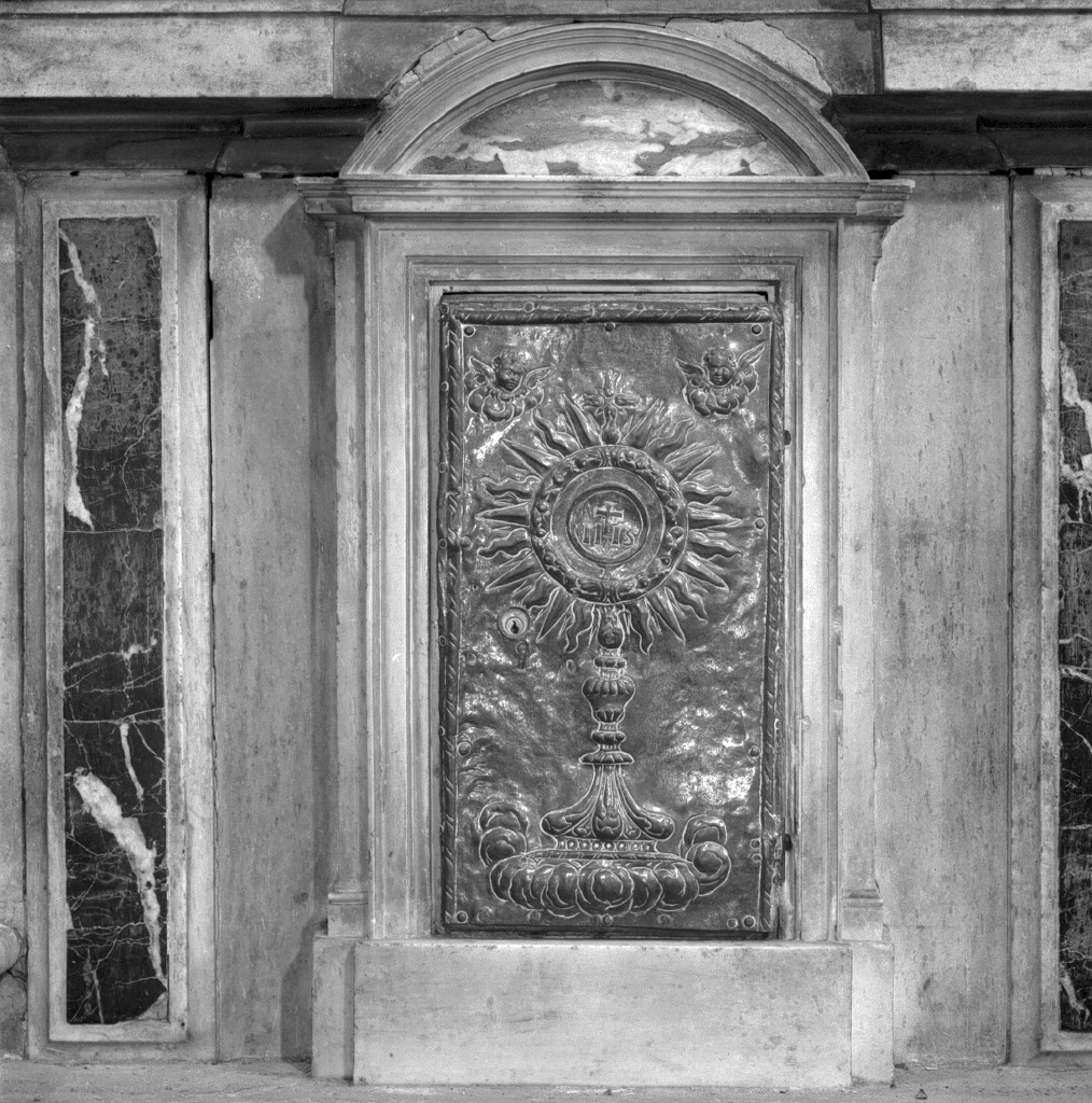 Lo sportello di rame dorato è riccamente decorato a sbalzo. Entro una cornice è raffigurato un ostensorio con motivi a bacello sulla base e sul fusto; la teca è circondata da una corona con motivi decorativi floreali e raggiera. Sugli angoli superiori dello sportello sono raffigurate due testine di angelo