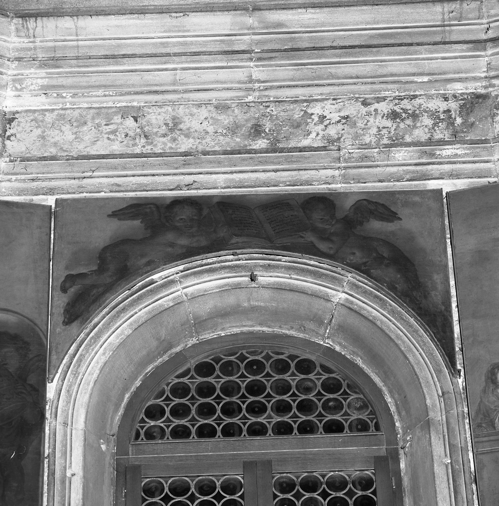 Due angioletti, i quali fanno arco congiungendosi verso il centro, reggono tra le mani un libro aperto