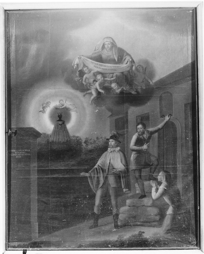 Personaggi: Madonna. Architetture: casa. Figure femminili. Figure maschili. Figure. Oggetti: statua nera di Madonna con Bambino