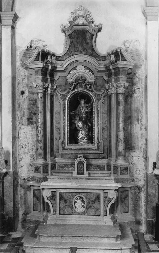 Altare con paliotto curvo con motivi a volute, alzata con colonne corinzie che reggono un frontone curvo spezzato