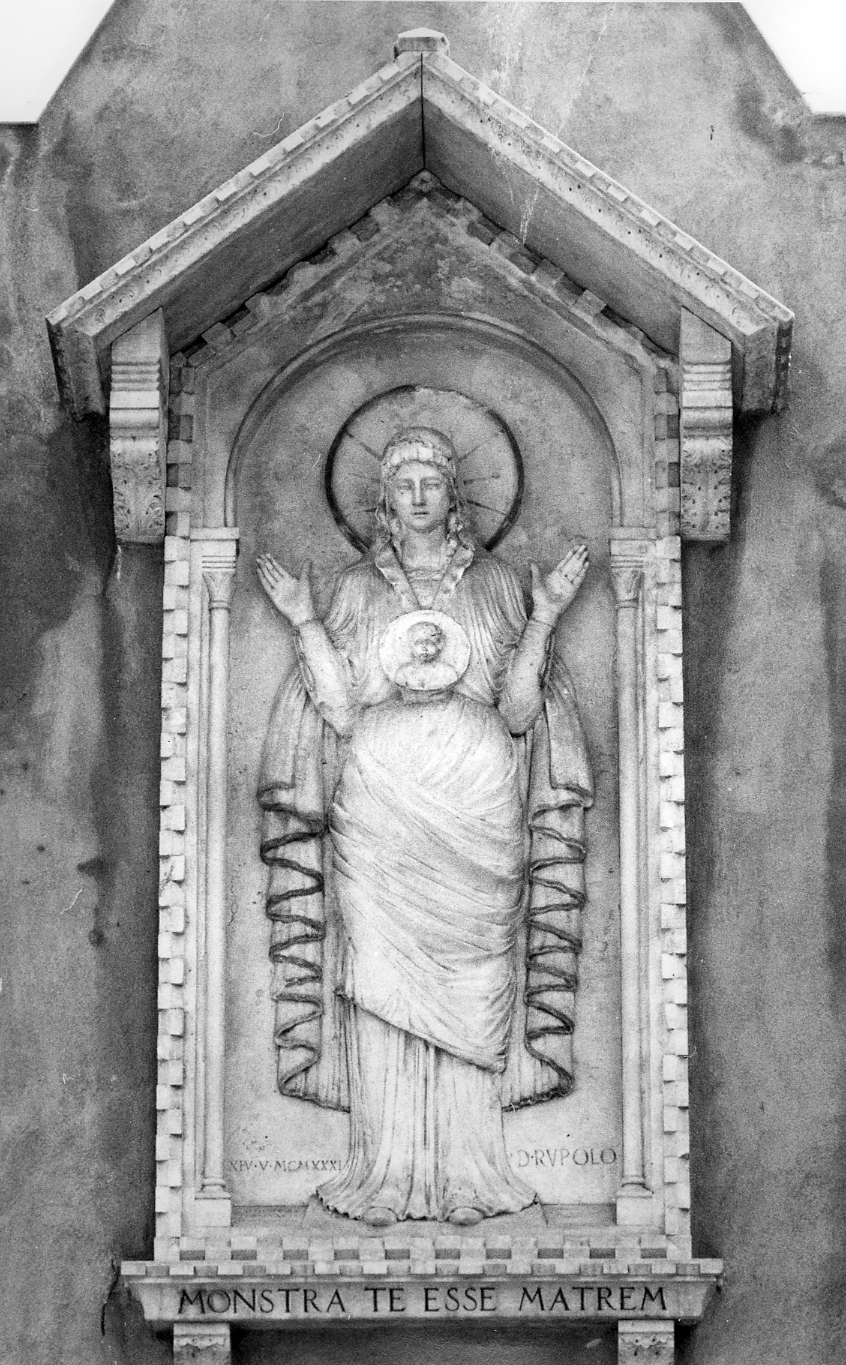 - NOTIZIE STORICO CRITICHE Madonna neobizantina nel modulo della "Platytera" di fattura elegante e raffinata eseguita dall'architetto Domenuico Rupolo nato a Caneva di Sacile il 21 Novembre del 1861. Una copia, dall'esecuzione più semplificata, si trova in campo S. Luca, a Venezia, ed è datata 1933; mentre il modello in gesso, di questa stessa opera si trova nella casa degli eredi del Rupolo, a S. Agnese (per gentile comunicazione della Sig.ra Elisabetta Rupolo)