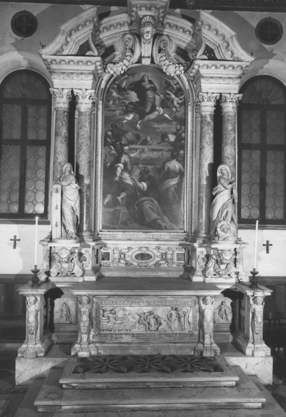 - NOTIZIE STORICO CRITICHE Il 10/02/1564 veniva fatta una richiesta ufficiale dal gastaldo della Scuola del Sacramento alla Compagnia dei Merciai, perchè spostasse il suo altare che impediva la visuale di quello del Sacramento (Mason Rinaldi, 1975-76). In cambio la Scuola avrebbe provveduto alle spese di rimozione (Mason Rinaldi, 1975). L'11/02/1574, i Merciai s'impegnavano a dare 30 ducati per la costruzione della chiesa, purché venisse concesso il luogo (Ghezzi A.,Cod. Cic. 1432). Al Di Bernardino spettano il progetto vinto con concorso (1577) e l'attuazione iniziata nel 1579. Il Lorenzetti (1963) lo data 1584 ca. AAT: Il Temanza (1778), il Moschini (1815) ed il Venturi (1940), ritengono che il disegno dell'altare spetti ad Alessandro Vittoria. Il Selvatico (1847) ed il Musatti (1904) lo dicono anche esecutore. Il Cessi (1961) lo dice eretto intorno al 1583