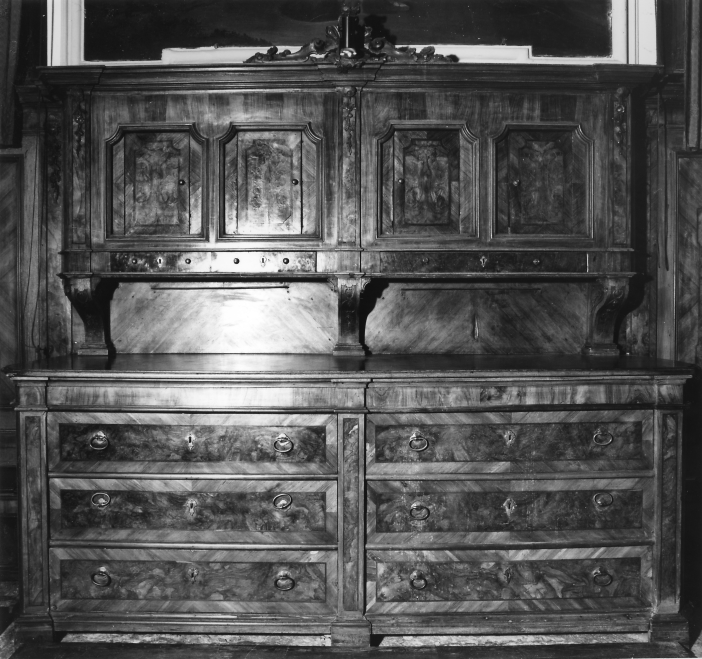 Credenzone a due corpi impiallacciato e filettato in radica di noce, poggiante su di una ossatura di abete. Il mobile inferiore presenta sulla fronte sei cassetti con bocchette e maniglie in bronzo. L'alzata, ad armadio, retta da tre mensole intagliate, presenta due tiretti e quattro ante evidenziate da cornici applicate. Due lesene ai lati ed una al centro sono arricchite negli epistigi da sobri pendenti d'ispirazione vegetale che richiamano la decorazione dell'intera boiserie. La cornice superiore è elegantemente sagomata e presenta un motivo floreale sulla cimasa