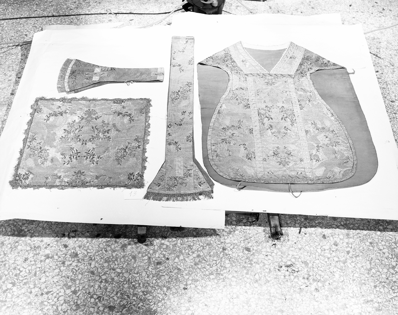 Paramento liturgico composto da tredici pezzi. Gallone: in seta e oro. Tessuto: lampasso spolinato. Motivo decorativo simmetrico rispetto all'asse centrale. Colore: giallo