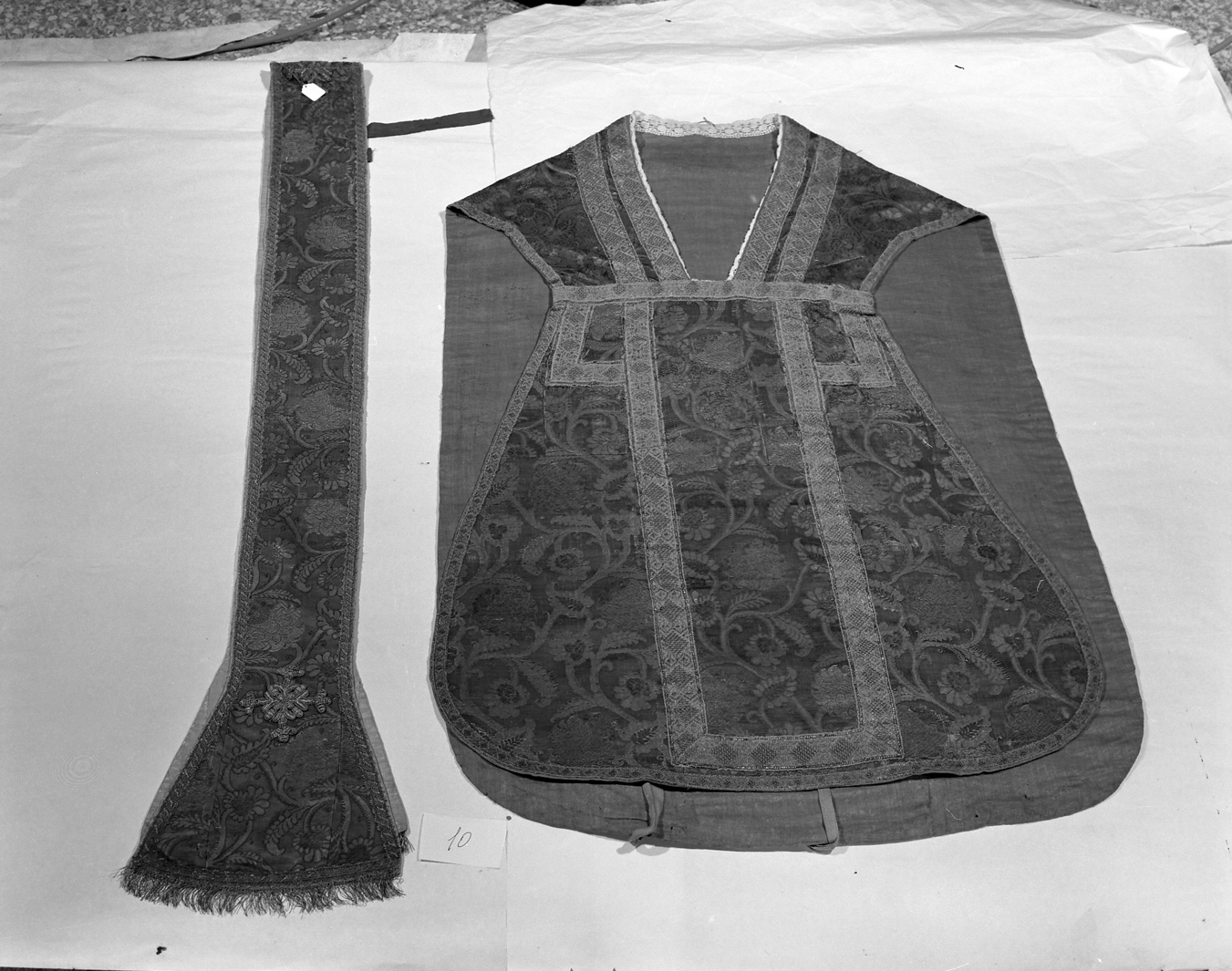 Paramento liturgico composto da nove pezzi. Tessuto: saia damascata. Gallone: in seta e in oro. Motivo decorativo a teorie orizzontali ad andamento ed orientamento alterno. Colore: rosso