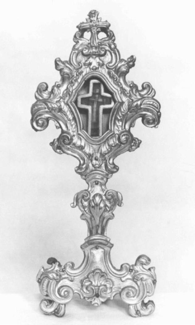 Fusto: poggiante su due piedini a volute con terminazioni a foglia, cartella: teca romboidale sagomata con cornice a volute, crocetta apicale