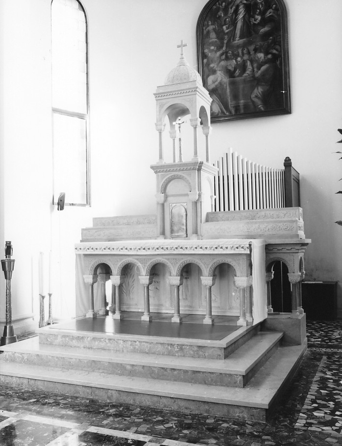 Altare con mensa sorretta da finto colonnato e sovrastato da piccolo ciborio