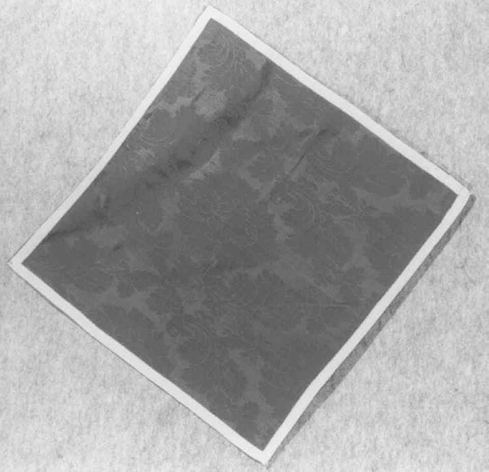 Tessuto: monocromo viola fondo raso faccia catena motivi gros de tours faccia trama. Gallone: a telaio in seta gialla. Fodera: gros de tours viola. Decorazione: motivo a maglie ovali a dop- pia punta