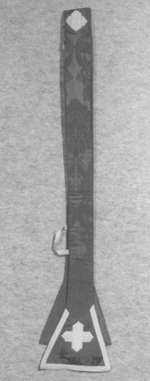 Tessuto: monocromo viola fondo raso faccia catena motivi gros de tours faccia trama. Gallone: a telaio in seta gialla. Fodera: gros de tours viola. Decorazione: motivo a maglie ovali a dop- pia punta