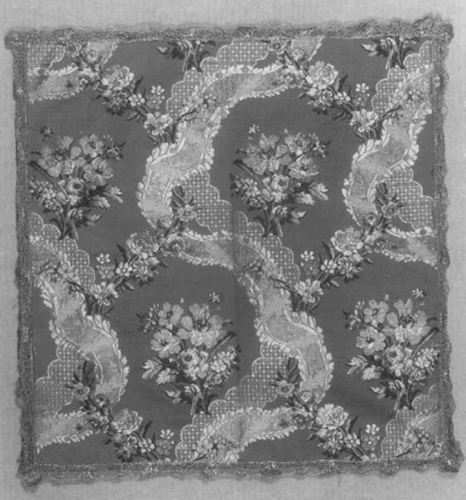Tessuto fondo arancione scuro con broccature in argento filato e lamellare e fili di seta policromi. Motivi decorativi: motivo a meandri con nastri e mazzi di fiori. Gallone a fuselli in oro filato e lamellare