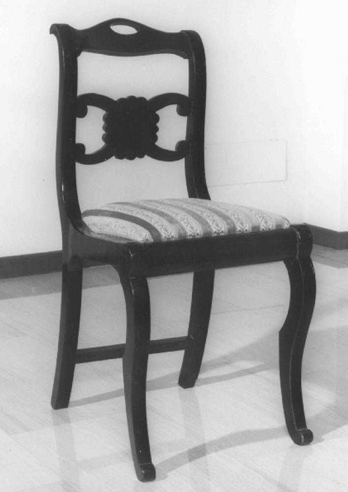 Sedia con schienale bucato e decorato con due riccioli stilizzati e un rosone al centro, sulla sommità dello schienale una medaglia. Il sedile è imbottito e le gambe anteriori lievemente sagomate