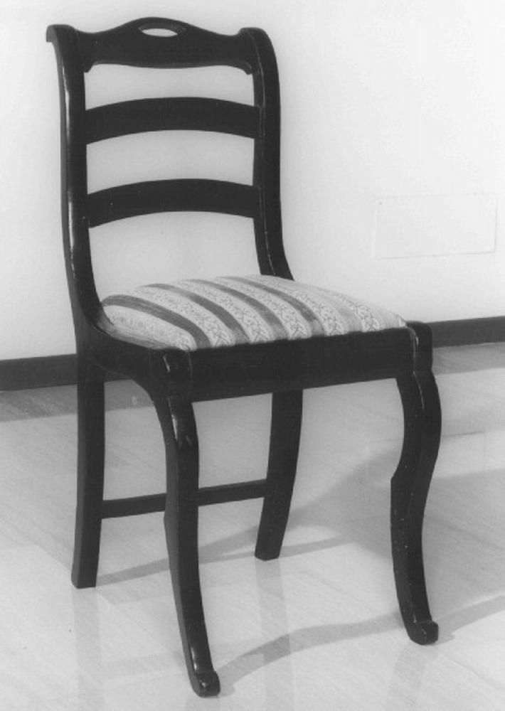 Sedia con schienale bucato unito da due liste parallele al centro sulla sommita' dello schienale una maniglia, sedile imbottito e gambe anteriori leggermente sagomate