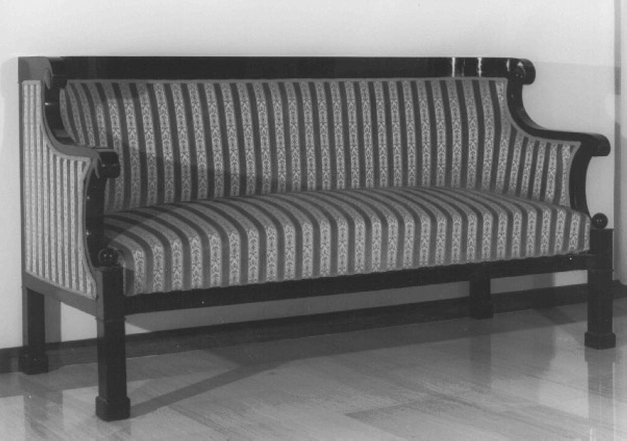 Divano con gambe squadrale e braccioli a due riccioli lievemente aggettanti, tutto imbottito