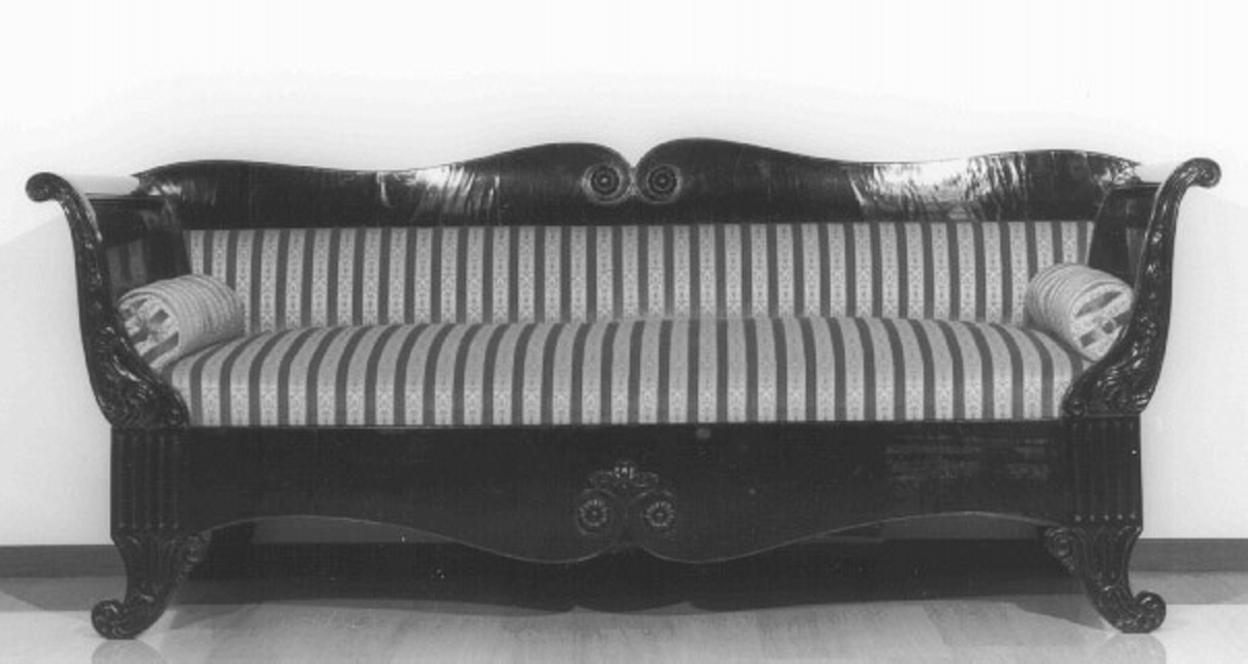 Divano imbottito con gambe a voluta e braccioli a ricciolo rivolti verso l'esterno, schienale modanato e decorato con due girali
