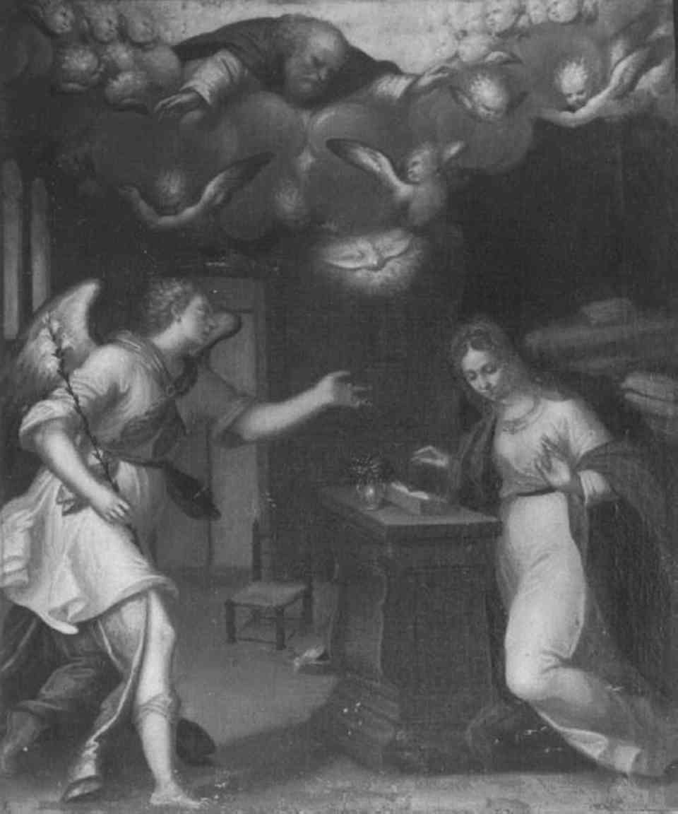 Personaggi: Madonna; San Gabrile Arcangelo; Dio Padre. Simboli: (Spirito Santo) colomba. Attributi: (San Gabriele Arcangelo) giglio. Figure: cherubini. Interno: stanza. Mobilia: inginocchiatoio; sedia. Oggetti: libro; cesto; vaso. Vegetali: fiori
