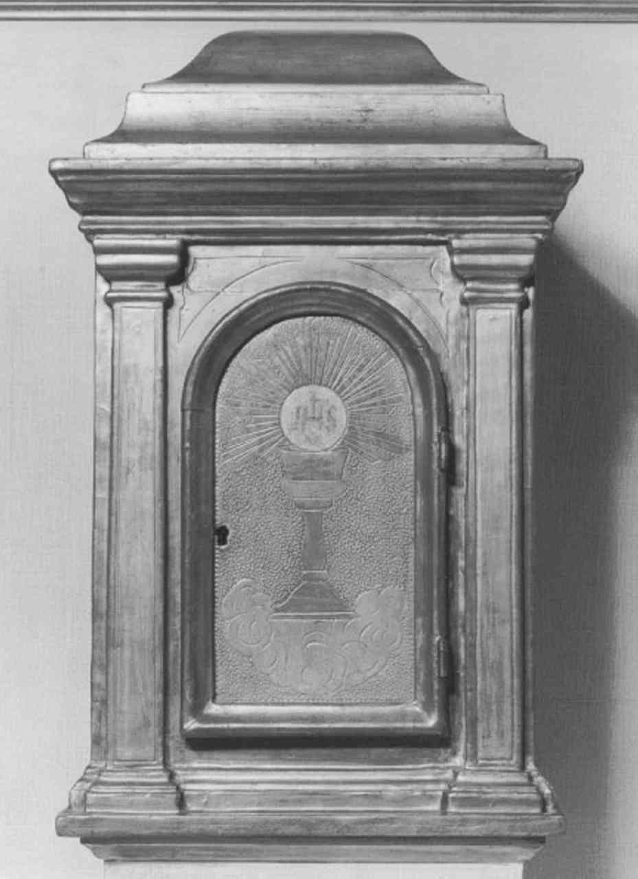 Struttura: a sezione rettangolare. Fac- cia anteriore: base e sommita' intaglia- ta a modanature; definita lateralmente da lesene con capitello. Portella: a lunetta recante calice con ostia raggiata e monogramma. Calotta: ribassata sagoma- ta