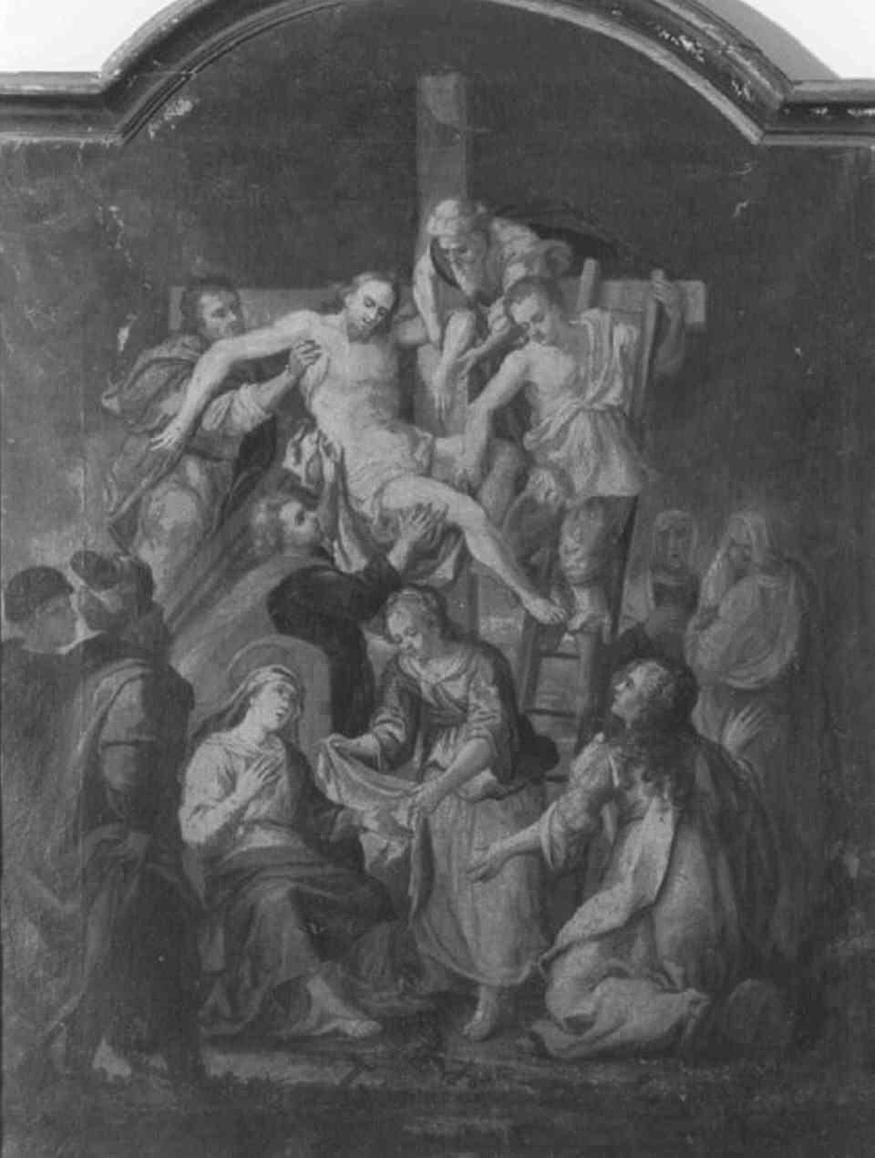 Personaggi: Cristo; Madonna; san Giovanni Evangelista; santa Maria Maddalena; Giuseppe d'Arimatea; Nicodemo. Figure: sacerdoti; pie donne. Oggetti: croce; scala