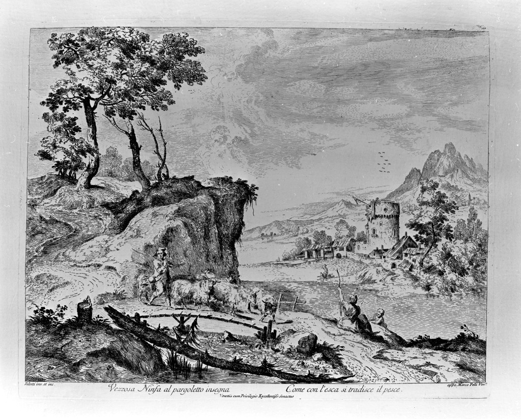 - ISCRIZIONI margine inferiore - Zilotti inv.et inc. - appo Marco Pelli Ven.a / Vezzosa ninfa ...pesce/ Venetiis cum Privilegio Excellentiss:Senactus - corsivo -