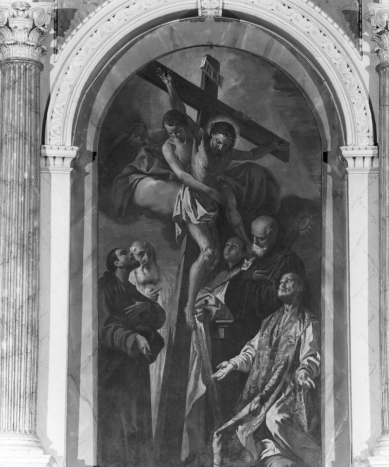 Personaggi: Gesù Cristo; San Francesco da Paola; San Luigi Gonzaga; San Simone; San Valentino. Attributi: (San Luigi Gonzaga) giglio; (San Simone) sega. Figure maschili: Santo. Figure: angelo. Oggetti: croce