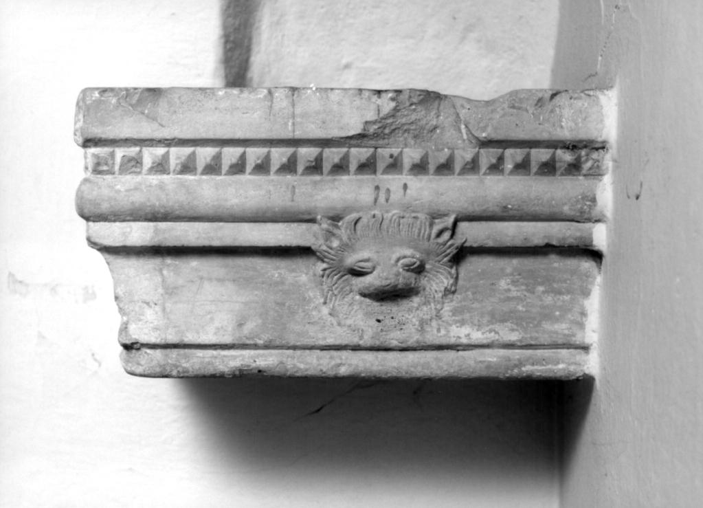 PIANTA A SEZIONE RETTANGOLARE INCASTRATA TRA LA PARETE DI FONDO E LA PARET E DESTRA. PROSPETTO MODANATO CON UN BASSORILIEVO RAFFIGURANTE UN MASCHER O NE