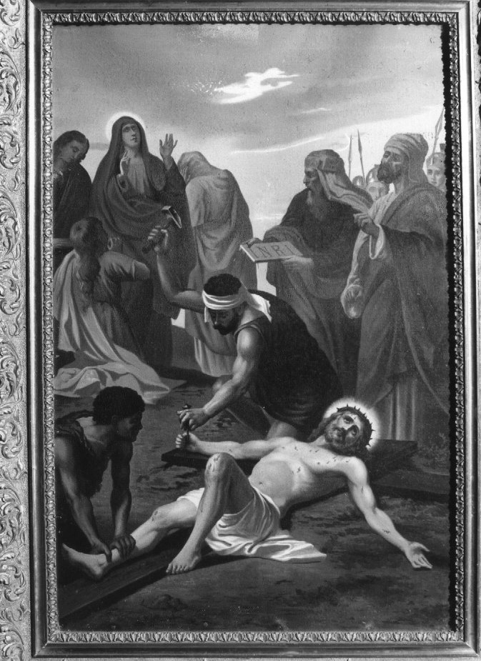Personaggi: Gesù Cristo; Madonna. Figure femminili. Figure maschili: soldati; schiavi; uomini. Oggetti: croce; martello; chiodi. Armi: lance