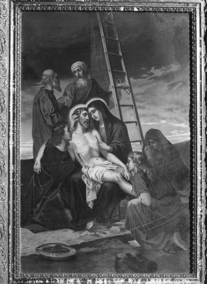 Personaggi: Gesù Cristo; Madonna; San Giovanni Evangelista; Santa Maria Maddalena; Nicodemo; Giuseppe d'Arimatea. Figure femminili. Oggetti: croce; scala; chiodi; pinze; catino