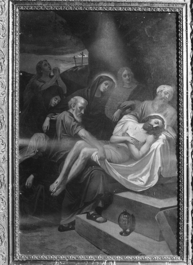 Personaggi: Gesù Cristo; Madonna; San Giovanni Evangelista; Santa Maria Maddalena. Figure femminili. Oggetti: sepolcro; Sacra Sindone; contenitore per oli