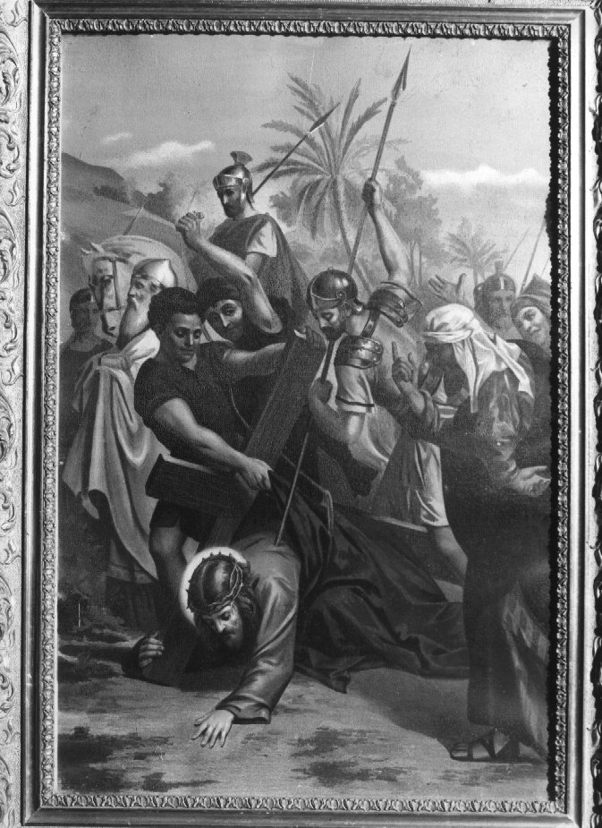 Personaggi: Gesù Cristo. Figure maschili: soldati; schiavi; uomini. Oggetti: croce; corda. Armi: lance. Piante
