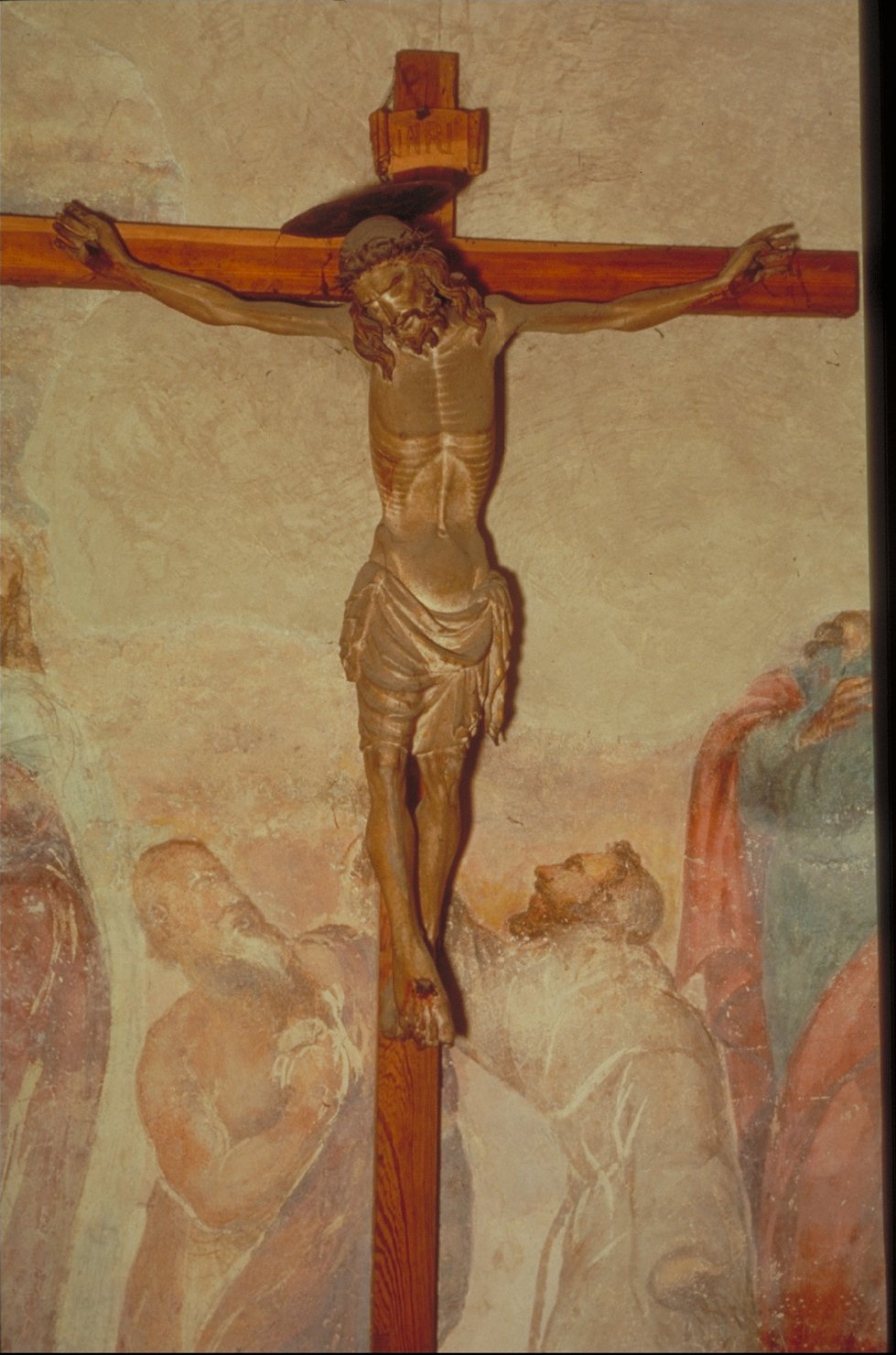 Cristo morto crocifisso con piedi sovrapposti, perizoma legato intorno al bacino, braccia tese e testa reclinata. Croce liscia con cartiglio