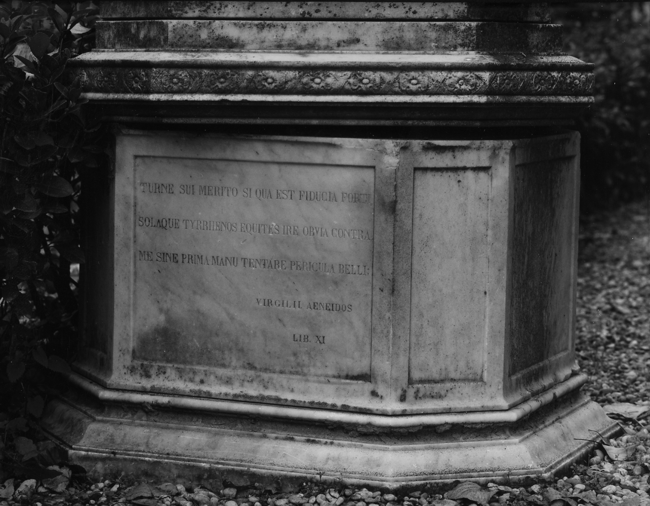 - ISCRIZIONI faccia maggiore - TURNE SUI MERITO SI QUA EST FIDUCIA FORTI/ SOLAQUE TYRRHENOS EQUITES IRE OBVIA CONTRA/ ME SINE PRIMA MANU TENTARE PERICULA BELLI;/ VIRGILII AENEIDOS/ LIB. XI - lettere capitali - a solchi - latino