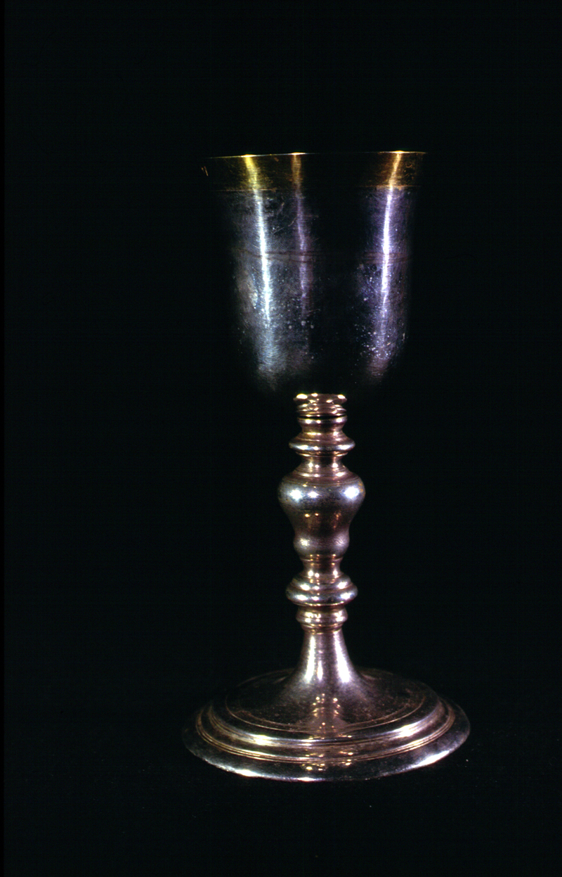 - NOTIZIE STORICO CRITICHE Calice assemblato la coppa in argento risale al sec. XVIII (vedi punzonatura) il piede ed il fusto in metallo tornito sono frutto di un restauro successivo