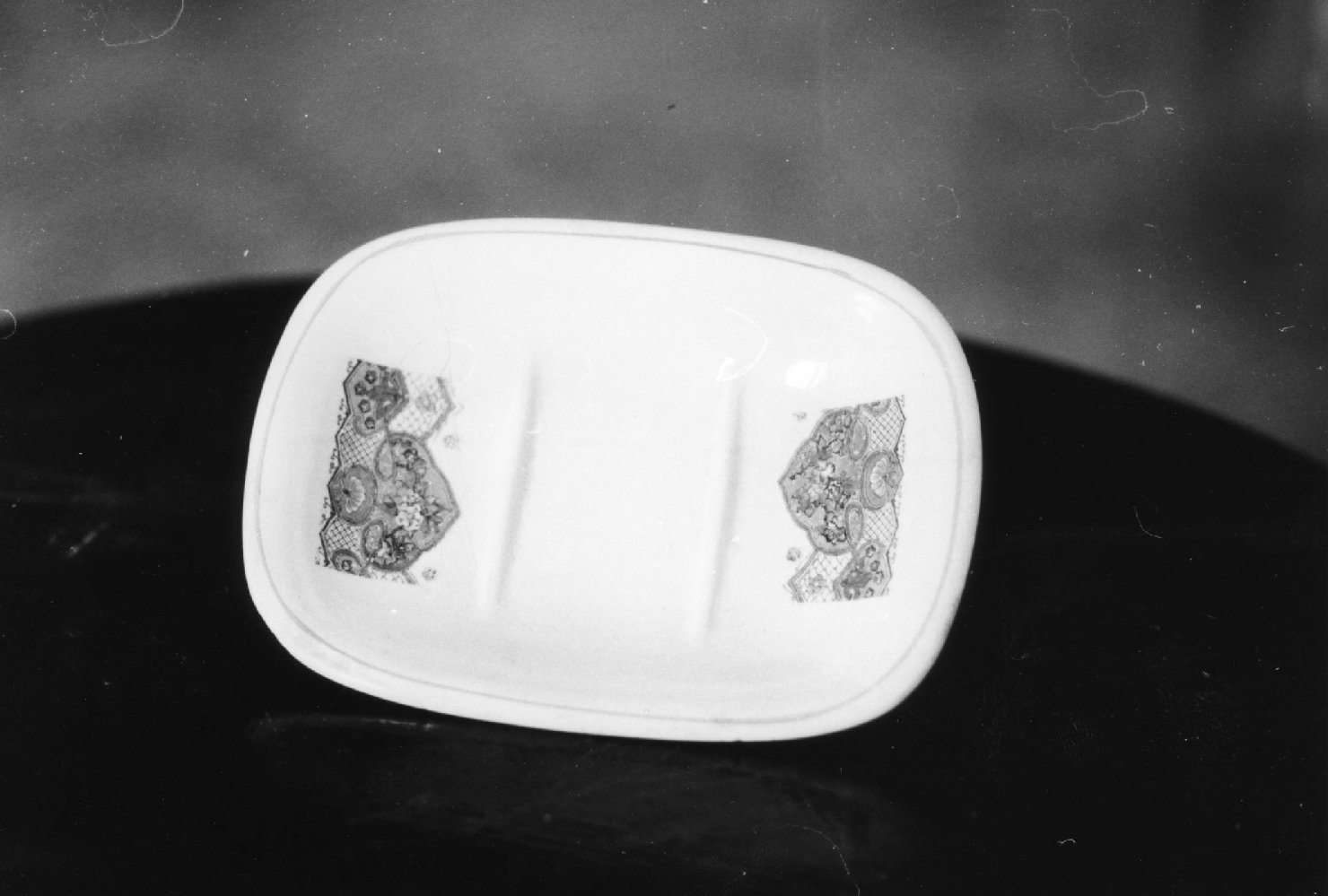 Portasapone di porcellana bianca con decorazione a motivo di merletto con piccoli fiorellini stilizzati sui due lati minori