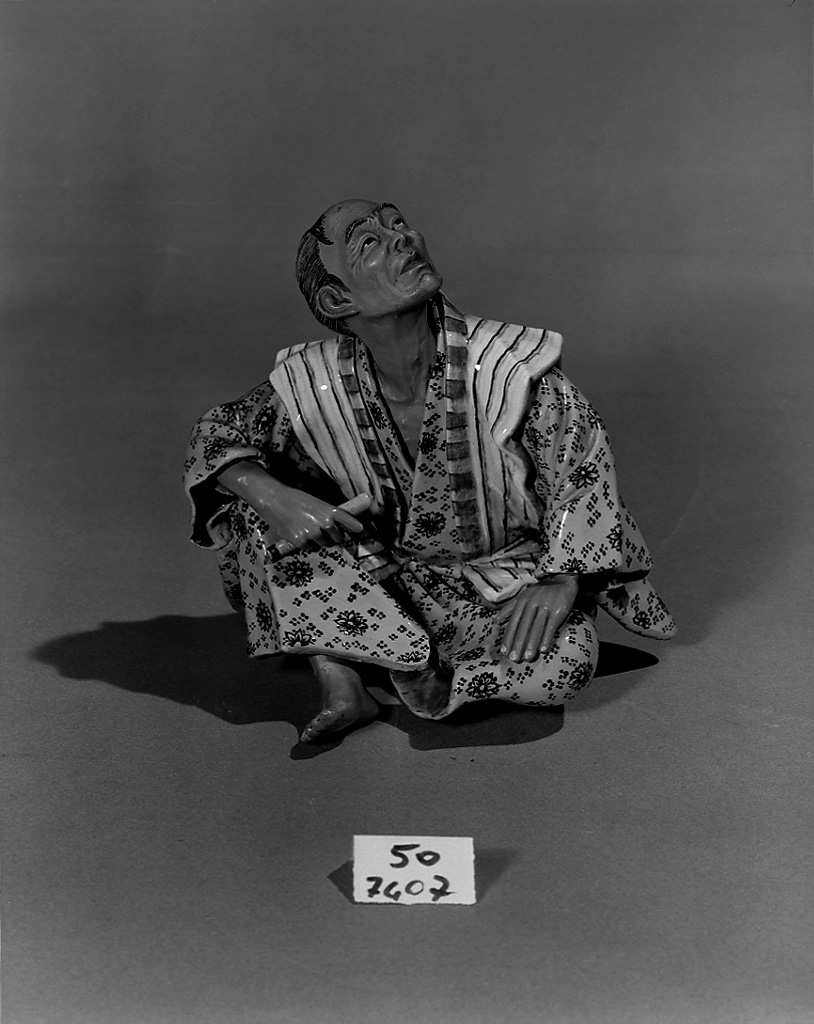Scultura finemente modellata e dipinta in policromia, senza base. Rappresenta un uomo riccamente vestito seduto a terra che guarda in alto