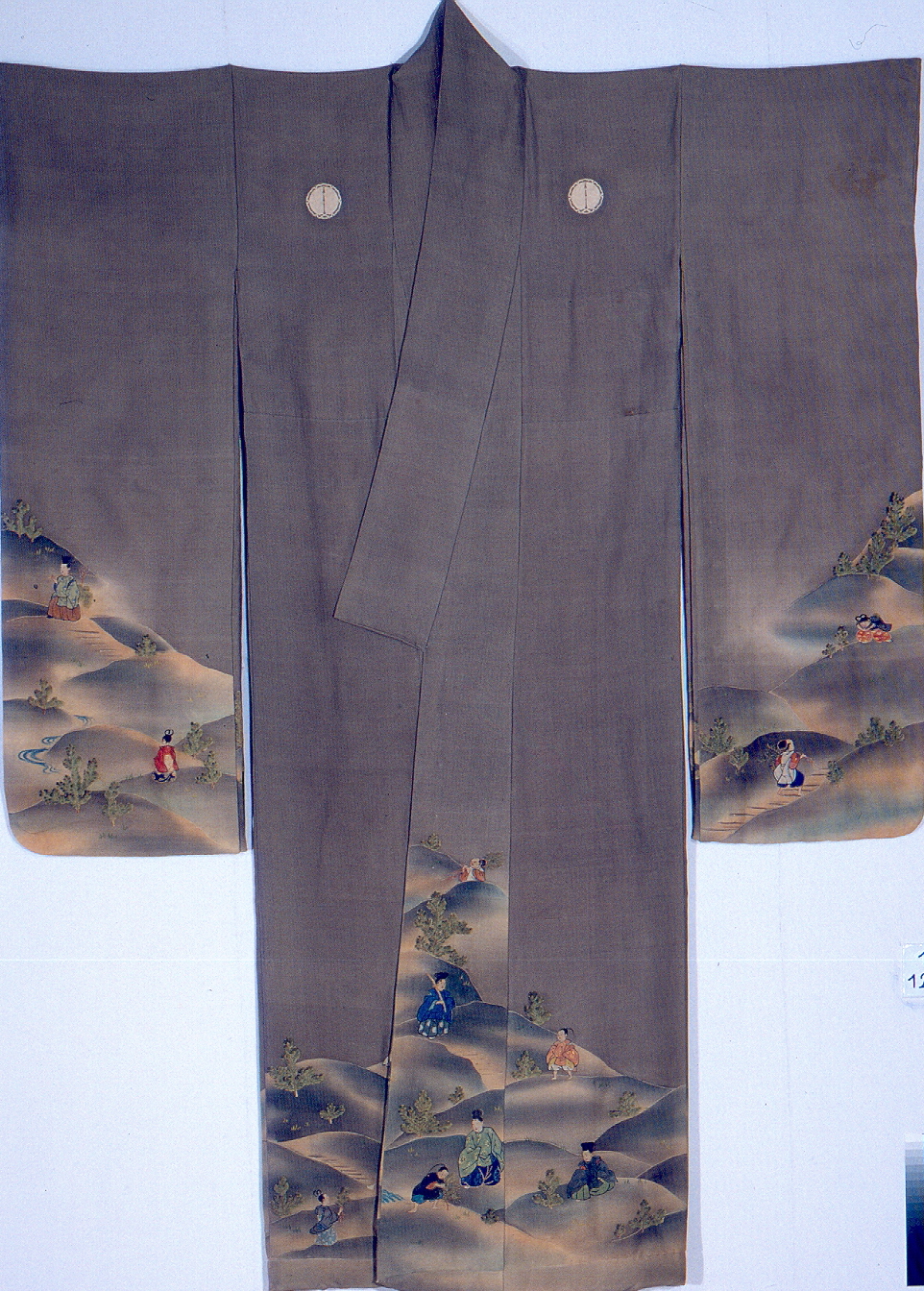 - NOTIZIE STORICO CRITICHE kimono del tipo furisode, elegante veste formale dalle maniche ricadenti, presenta una cucitura orizzontale da leggersi come probabile riadattamento della veste. Il decoro si sviluppa sul fondo dell'abito e delle maniche (stile susu-moyō). E' dipinto un paesaggio collinare con personaggi vestiti di abiti e copricapi di epoca Heian (794-1185) intenti a raccogliere rami di pino. Al Victoria & Albert Museum è conservato un libro per modelli di kimono nn. 704-737-1901 nel quale appare un furisode con la medesima iconografia, http://collections.vam.ac.uk/item/O393177/design-for-kimono/ (E. de Concini)