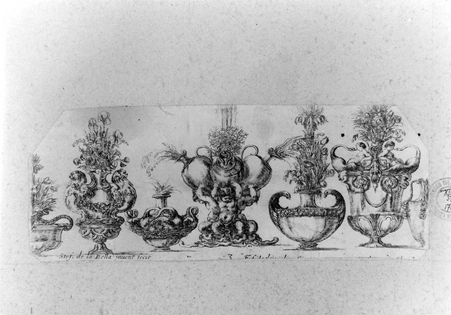- ISCRIZIONI in basso a sinistra - Stef. de la Bella jnuent fecit / 3 F(...) - corsivo - latino