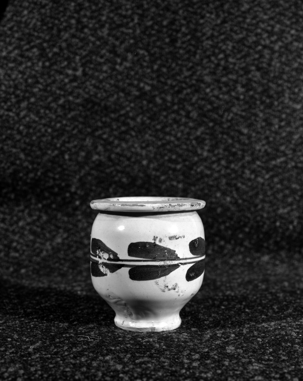 Al centro del corpo fascia di fogliette cuoriformi di colore blu su fondo bianco