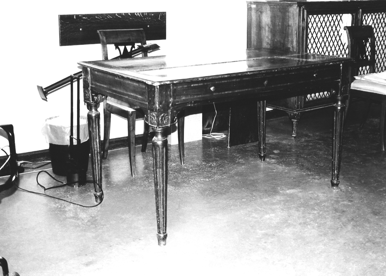 tavolo quadrangolare con gambe a colonna scanalate con motivo a fiore intagliato nella parte superiore, piano con due cassetti decorati da un filo intarsiato in essenza chiara che percorre il profilo, prese a pomello in ottone