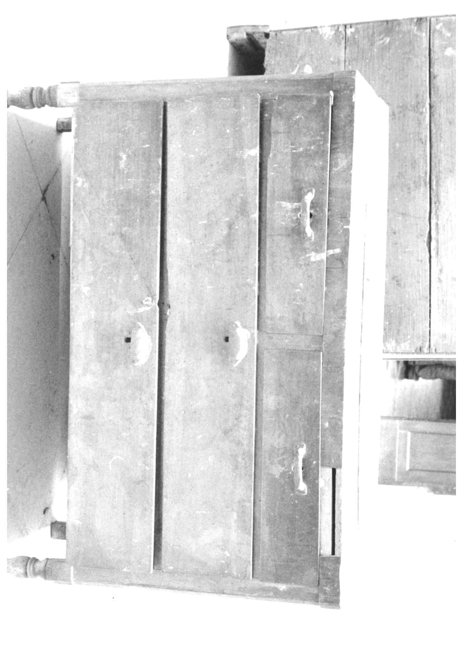 cassettone in legno con piedi anteriori torniti, due cassetti grandi con maniglie a mensola, due cassetti piccoli con maniglie nella parte superiore