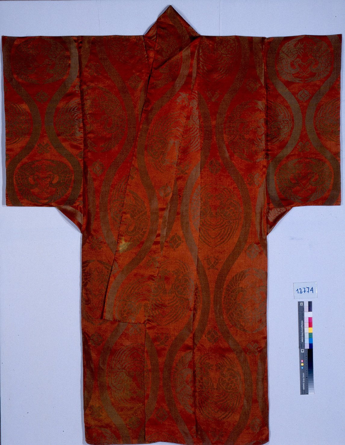 - NOTIZIE STORICO CRITICHE Probabile veste da camera sfoderata dai motivi decorativi benauguranti (si veda l'attaccatura delle maniche e la grandezza del decoro). Le linee verticali a serpentina appaiate sono abbinate a tartarughe dalla coda lunga, simbolo di longevità e prosperità assieme alle gru e a simboli di buon auspicio quali lo "shippō" (cerchio formato da quattro archi di cerchio con una perla per ogni punto d'intersezione) e i "choji", i chiodi incrociati (E. de Concini)