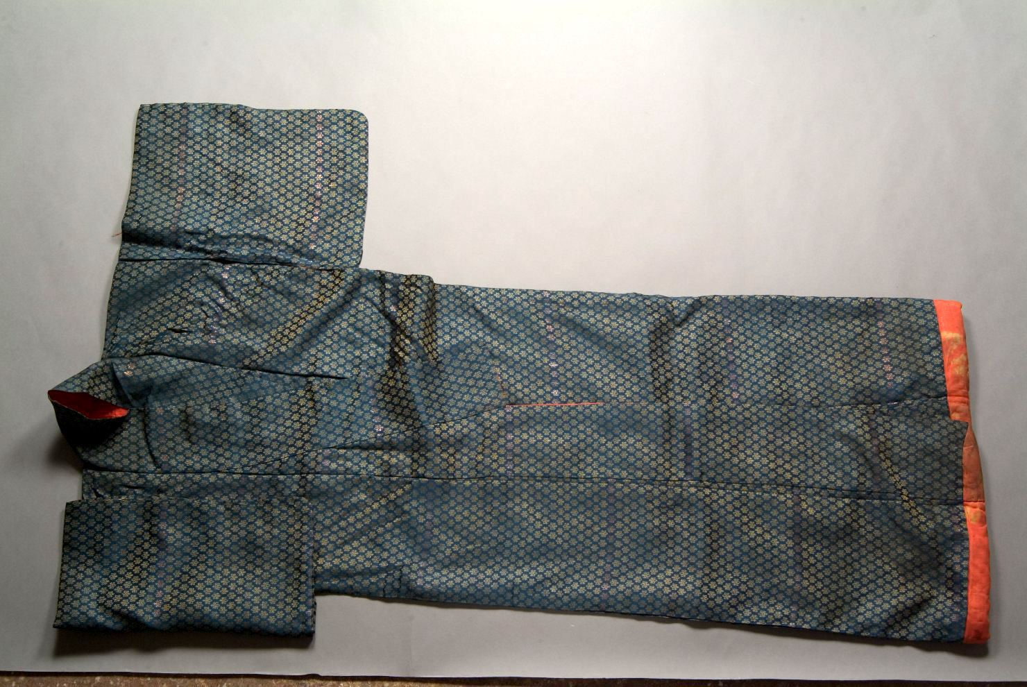 - NOTIZIE STORICO CRITICHE Il motivo decorativo della paulonia stilizzata ripetuta su tutta la pezza è tipico dei kinran, tessuti ove il decoro è realizzato interamente dalla trama supplementare in oro cartaceo. Su questo abito l'uso dell'oro è parsimonioso, sostituito dalla seta giallo ocra (E. de Concini)