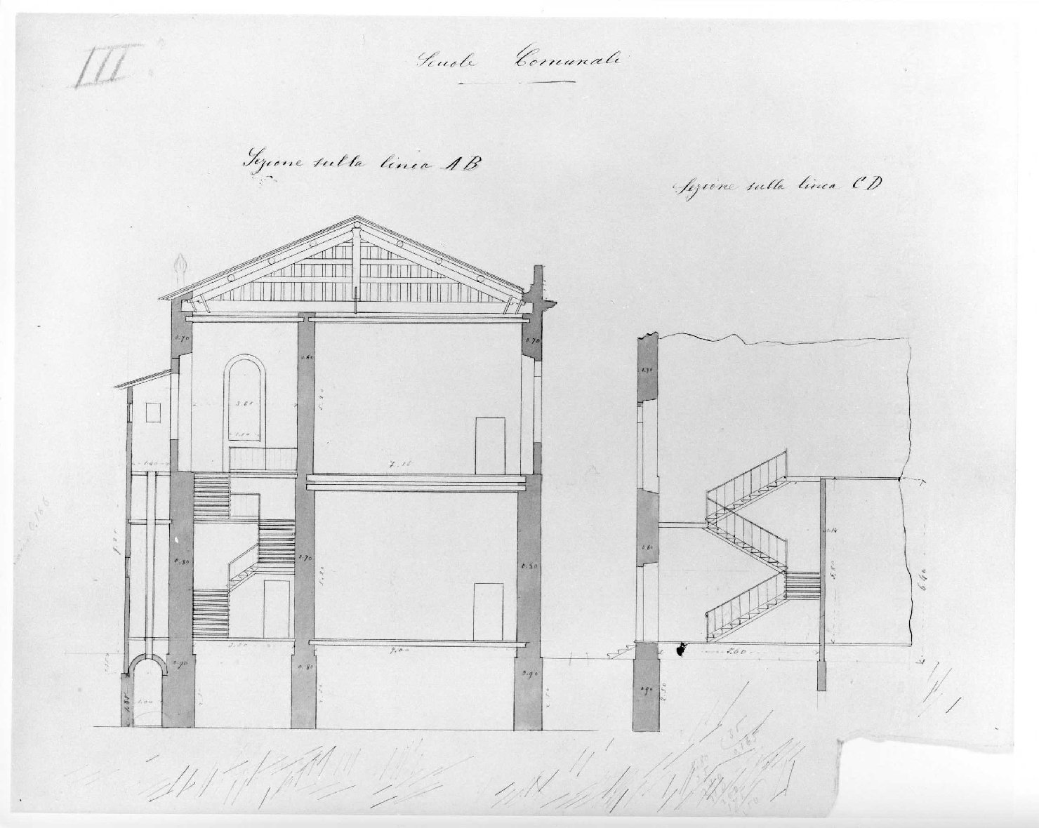 Disegno a penna e inchiostro nero, acquerello grigio con due sezioni di edificio scolastico. Annotazioni di misure. La carta reca una filigrana con la scritta S-ANNONAY ANC.NE MANUF.RE CANSON & MONT. Sul verso è incollato un cartoncino con il numero di inventario