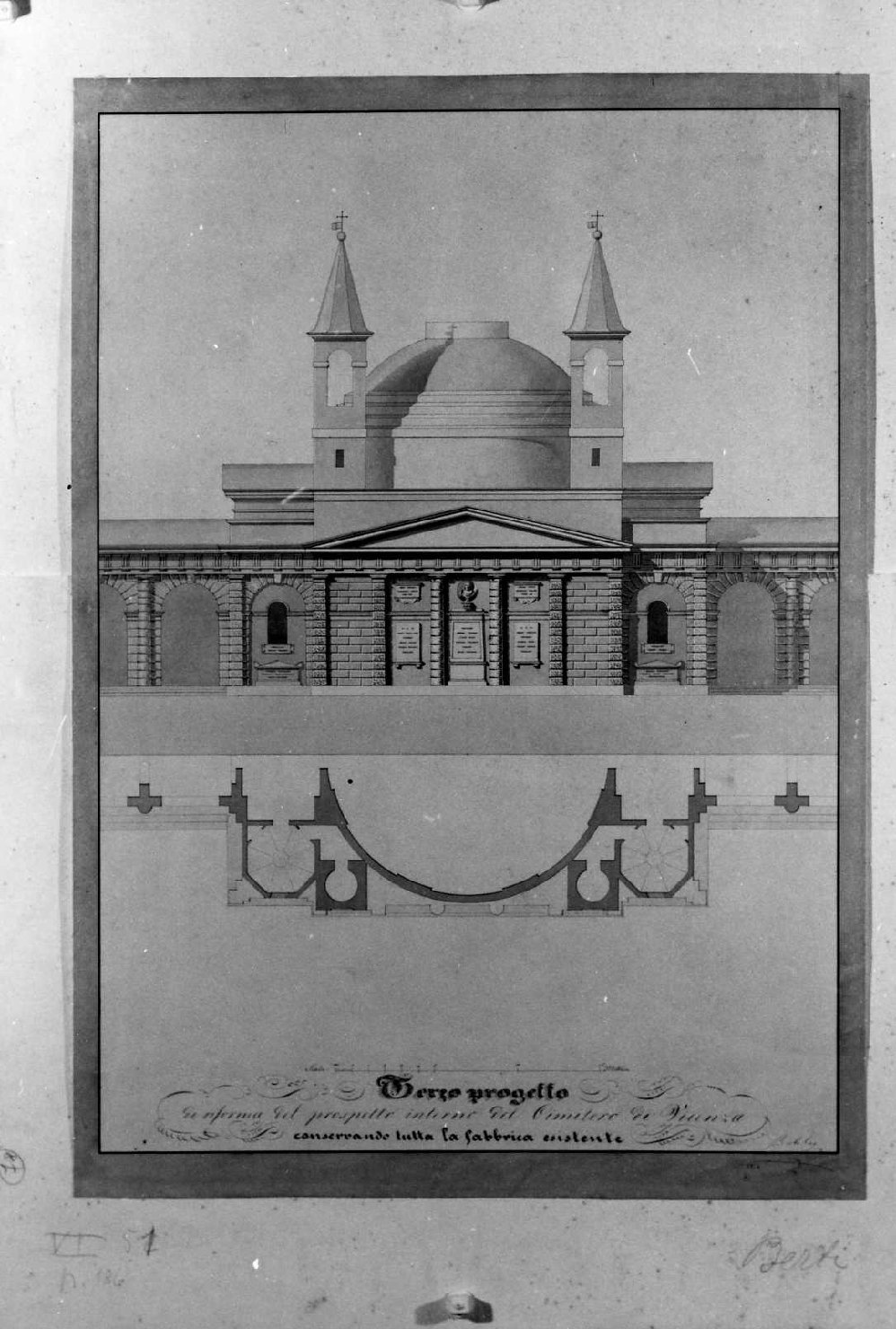 - ISCRIZIONI al centro, in basso - Terzo progetto / di riforma del prospetto interno del Cimitero di Vicenza / conservando tutta la fabbrica esistente - corsivo - a penna -