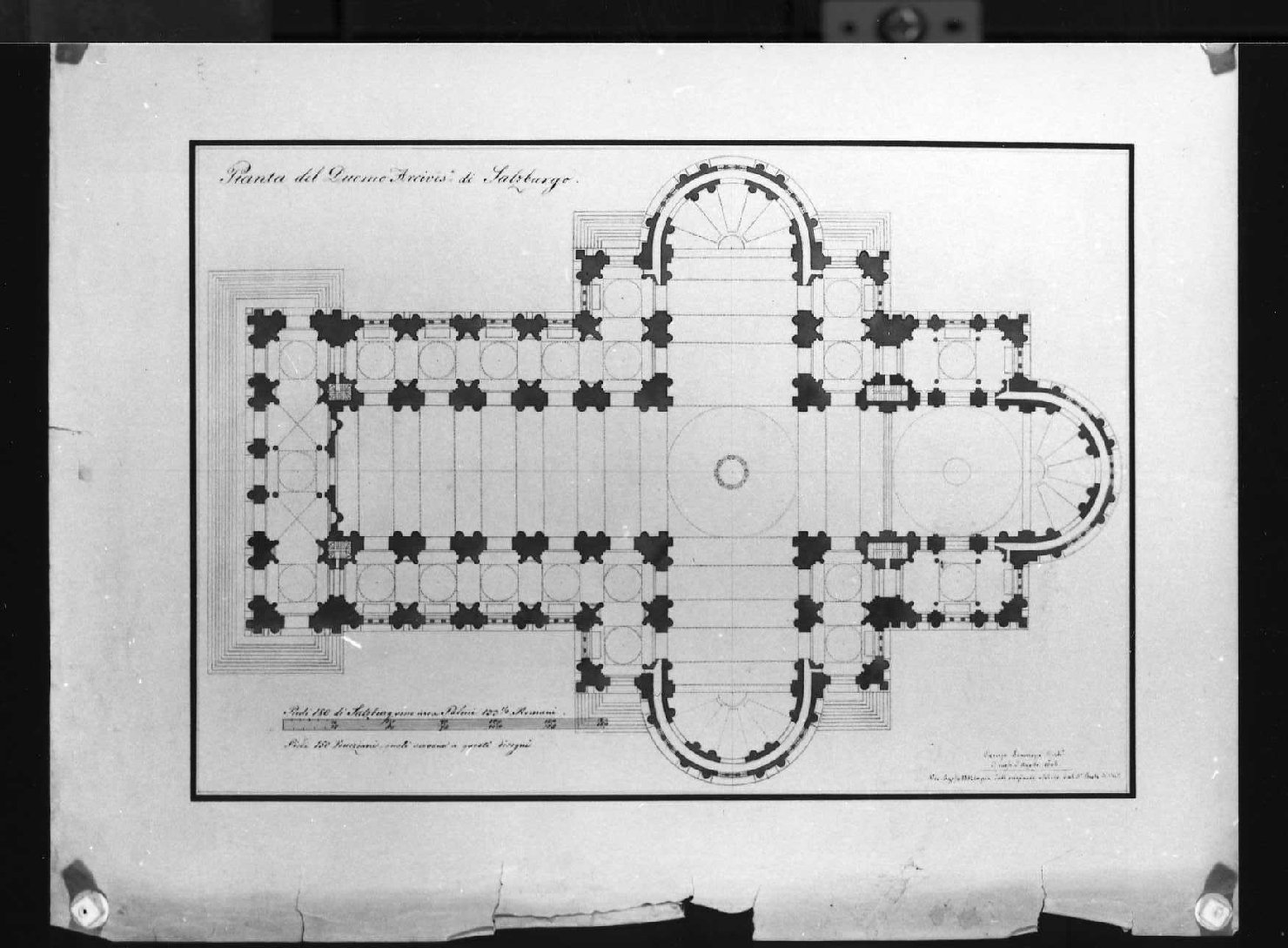 - ISCRIZIONI in alto a destra - Pianta del Duomo Arcives.e di Salzburgo - corsivo - a penna -