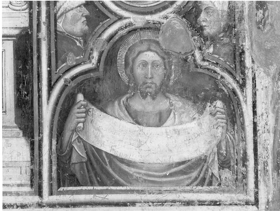 Raffigurazione entro cornice trilobata. In alto ai lati della cornice, due ritratti di profilo (Seneca e Boezio)