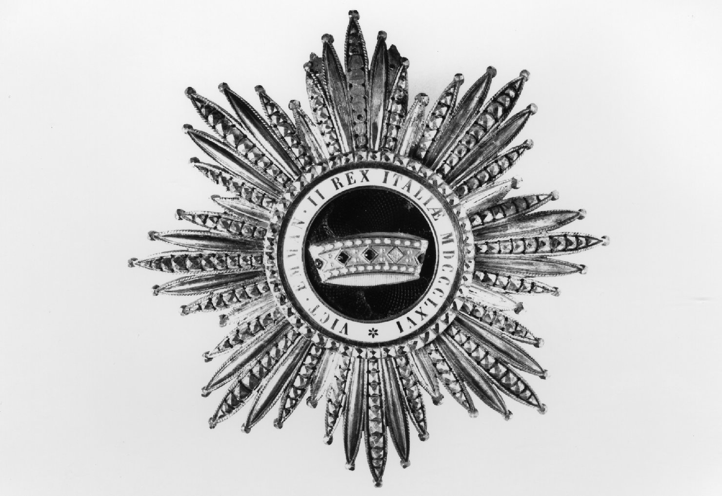 Placca costituita da una raggiera d'argento a otto punte caricata al centro di uno scudetto circolare, smaltato di azzurro, con la Corona Ferrea e circondato da legenda su smalto bianco. Lo scudetto è sormontato dall'aquila nera coronata avente nel petto la croce bianca di Savoia in campo rosso