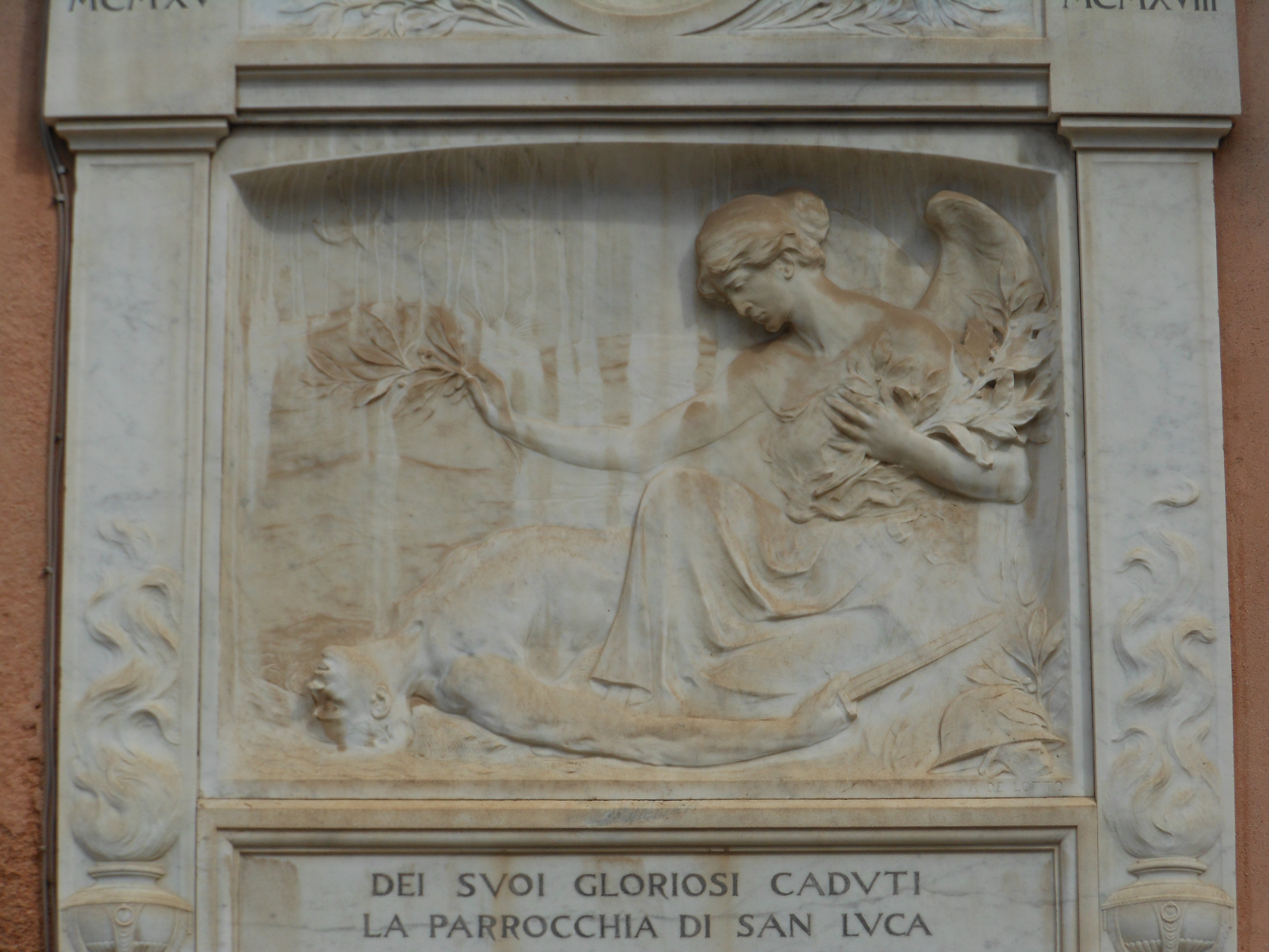 - ISCRIZIONI in basso, in centro - MCMXV MCMXVIII / DEI SVOI GLORIOSI CADVTI / LA PARROCCHIA DI SAN LVCA / RICORDA CON RICONOSCENZA / I CARI NOMI L'EROICO SACRIFICIO / CON RELIGIOSA PIETA' NE SUFFRAGA LE ANIME / ALLEGRI GINO / BORTOLVZZI GIORGIO / BORTOLVZZI NINO / BVNA ETTORE / CAMPANER MARIO / DAL BO' ANTONIO / DE ZIGNO ACHILLE / MARTENS LVIGI / MARZATO PIETRO / ONGARO VITTORIO / PICCOLO LORENZO / RIZZO DOMENICO / RIZZO OLIVO / TOLOTTI GIVLIO / ZAMBON AGOSTINO / MCMXXII - lettere capitali e numeri romani -